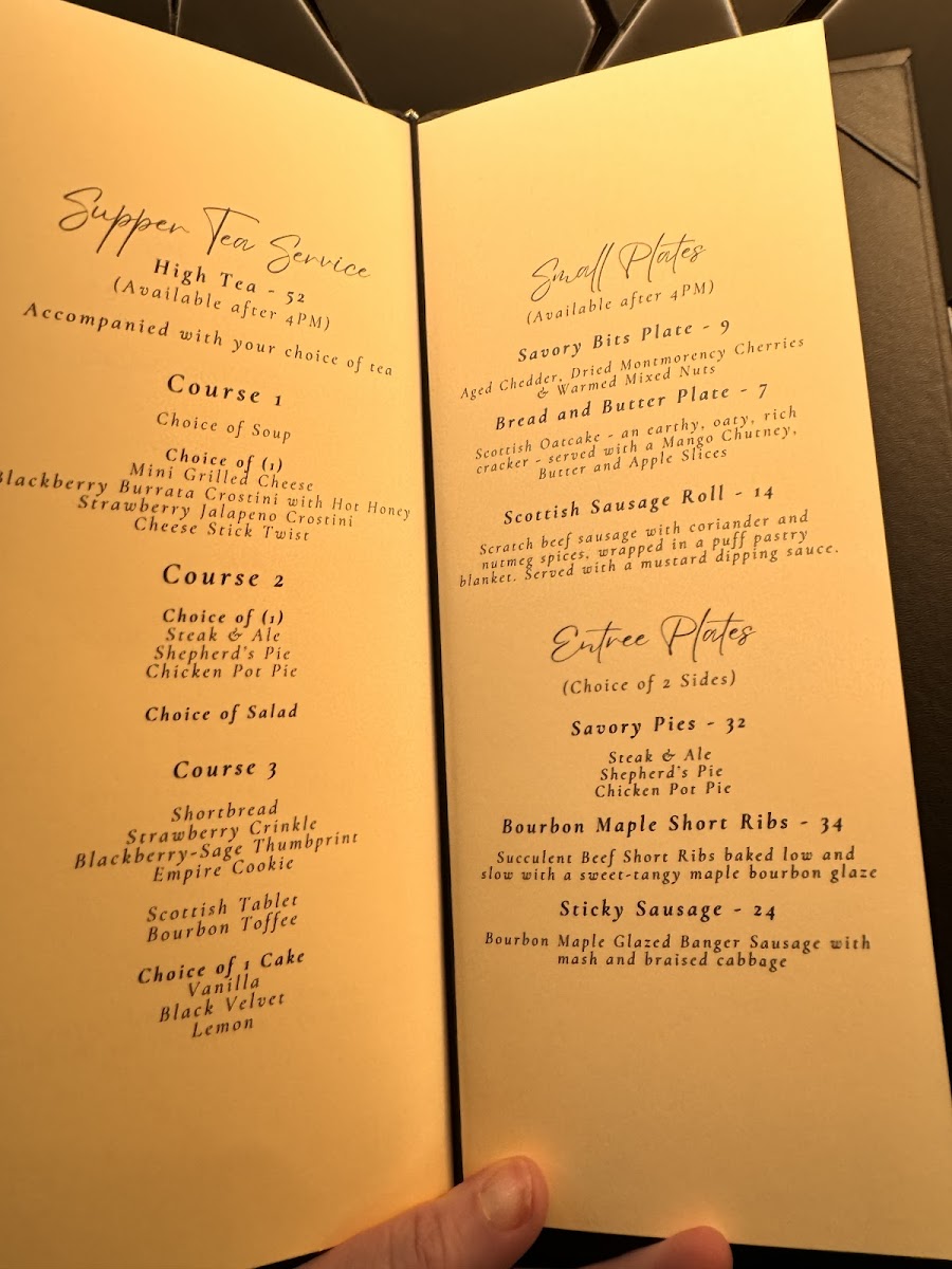 20 oz Tea accompanied by a scone with clotted cream and jam, choice of Fruit Kabob with Pear Sauce or Yogurt Parfait with house-made granola and mixed fruit.